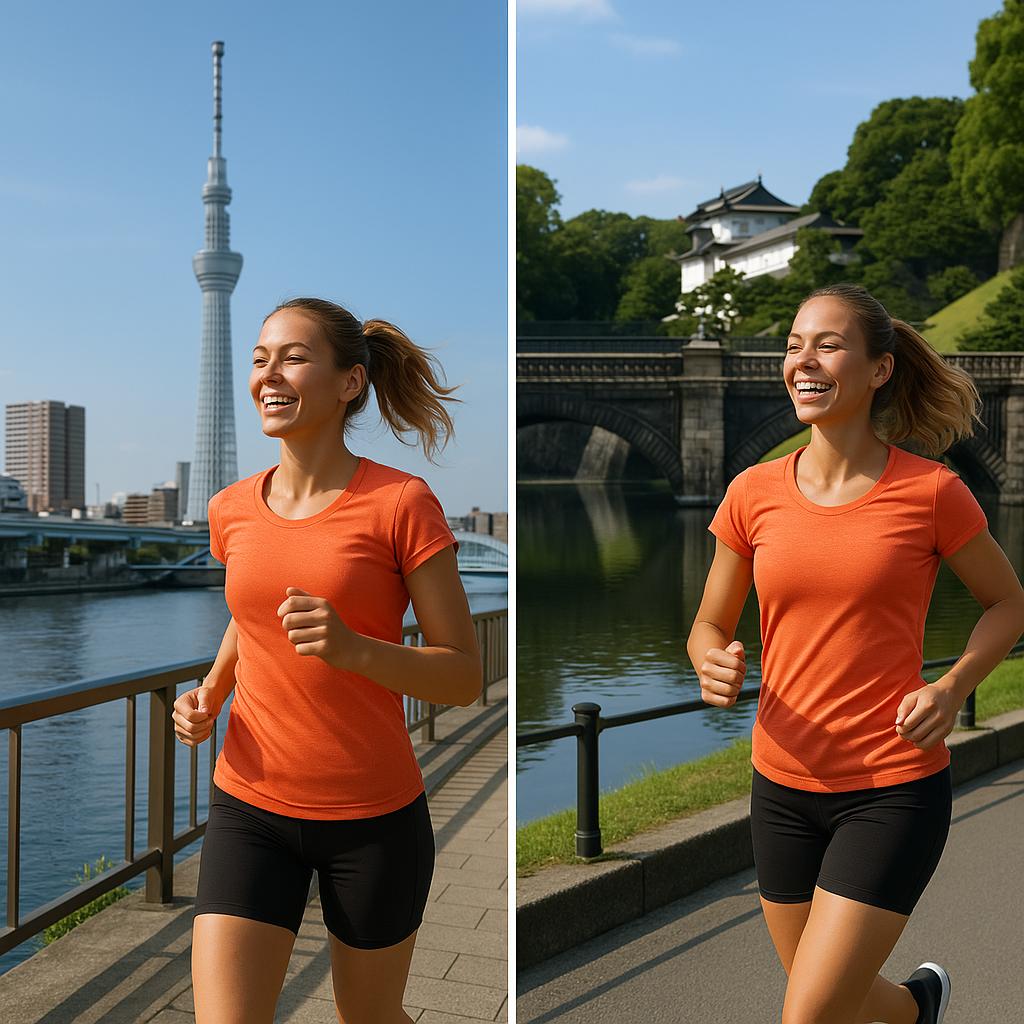 여름철 도쿄는 매우 덥고 습도가 높기 때문에, 이른 아침이나 해가 진 후 러닝을 추천합니다. 수분 보충도 꼭 잊지 마시길!